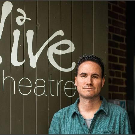 Portrait headshot of Jack McNamara standing in front of Live Theatre's door - dressed in a green open necked shirt and looking to camera.